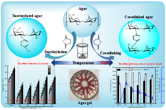 此外,针对琼脂化学修饰过程凝胶强度必然下降的瓶颈问题,课题组通过调控温度,实现环状酸酐与琼脂的可控交联。环状酸酐交联改性琼脂兼具高透明度和高凝胶强度等优点,在食品、日化和生物医药等领域均有广泛的应用价值。