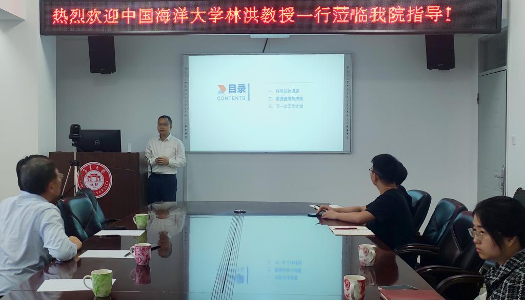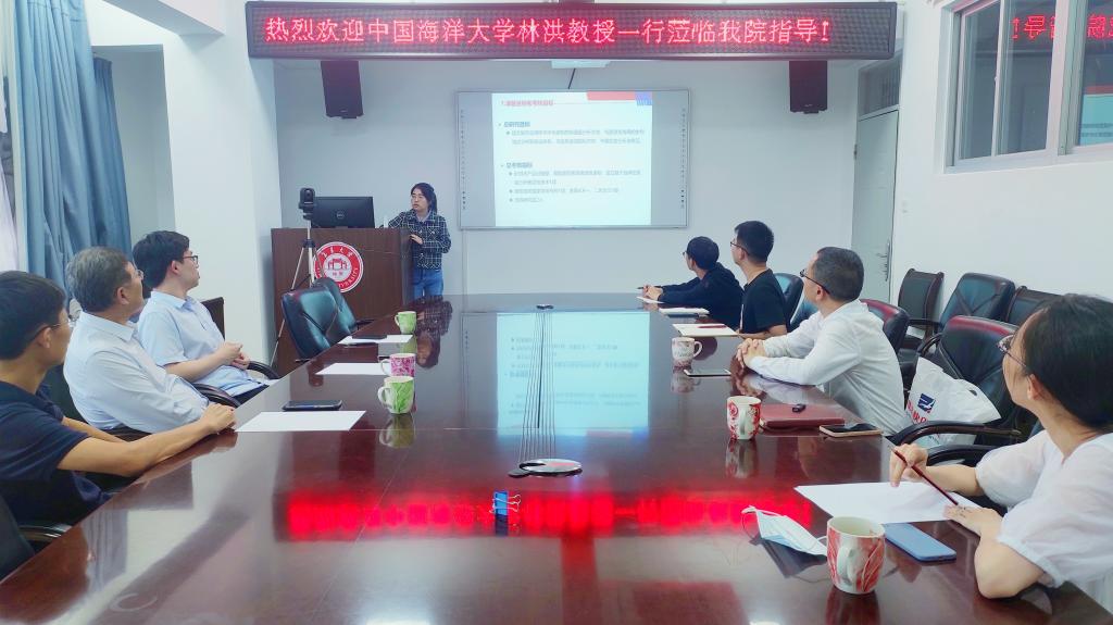 林洪教授所在中国海洋大学为国家重点研发计划“蓝色粮仓科技创新”重点专项(水产品危害物质检测与质量控制技术,2019YFD0901700)的项目牵头承担单位,我院承担了该项目中两项子课题的研究工作。交流中,刘光明教授和曾珺副教授先后汇报了课题任务研究进展,林洪教授就此提出了启发性的问题和建议,并针对水产品质量安全相关问题与学院师生进行了深入交流。